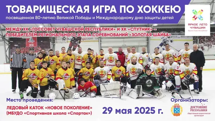 29 мая на льду катка «Новое поколение» прошёл матч, посвящённый 80-летию Великой Победы и Дню защиты детей. Это мероприятие объединило разные возрастные группы и стало настоящим праздником спорта.
